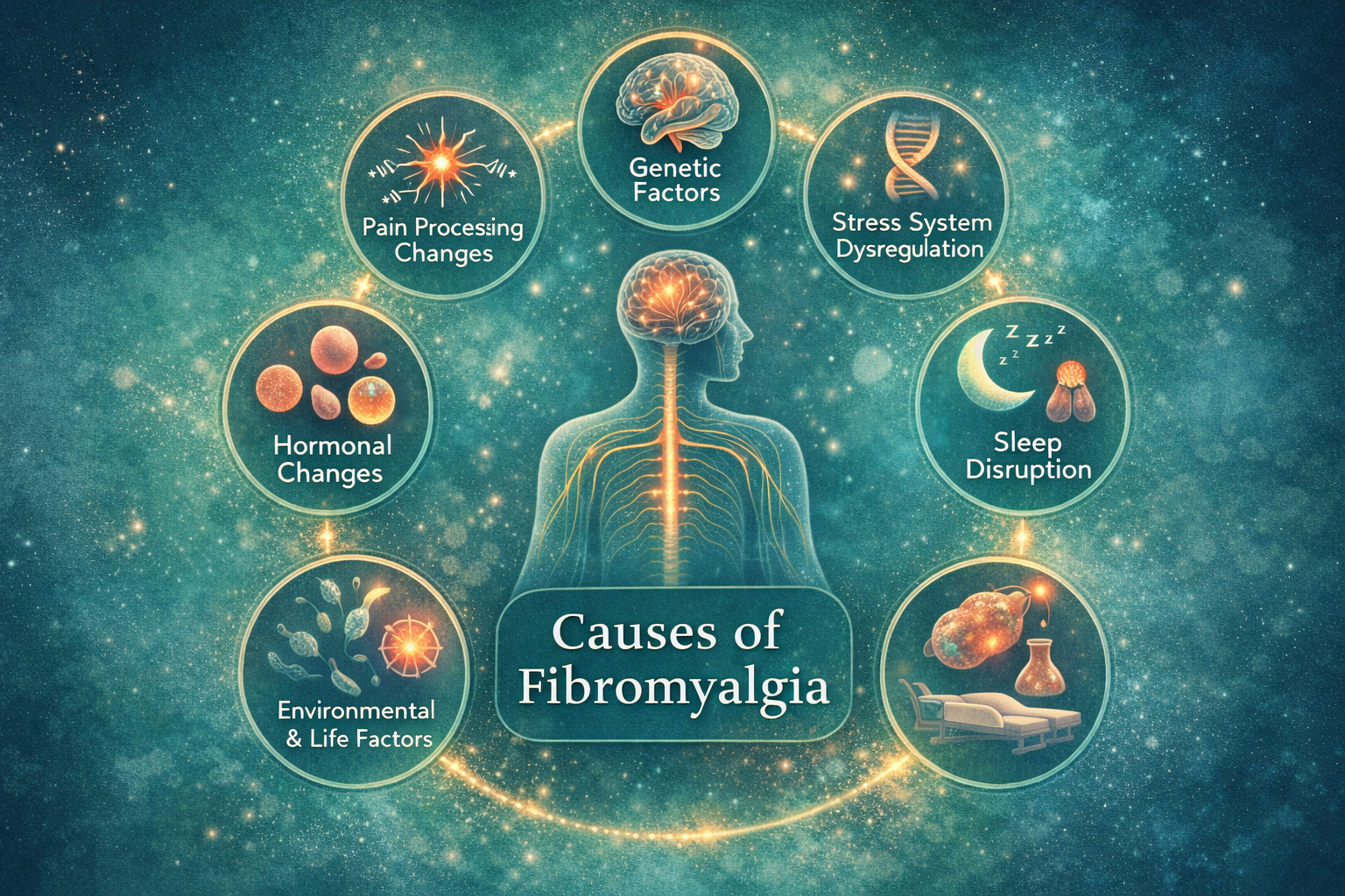 The honest answer from modern medical research is that fibromyalgia does not appear to have a single cause. Instead, scientists believe it develops from a combination of factors that affect how the brain and nervous system process pain and stress signals throughout the body.